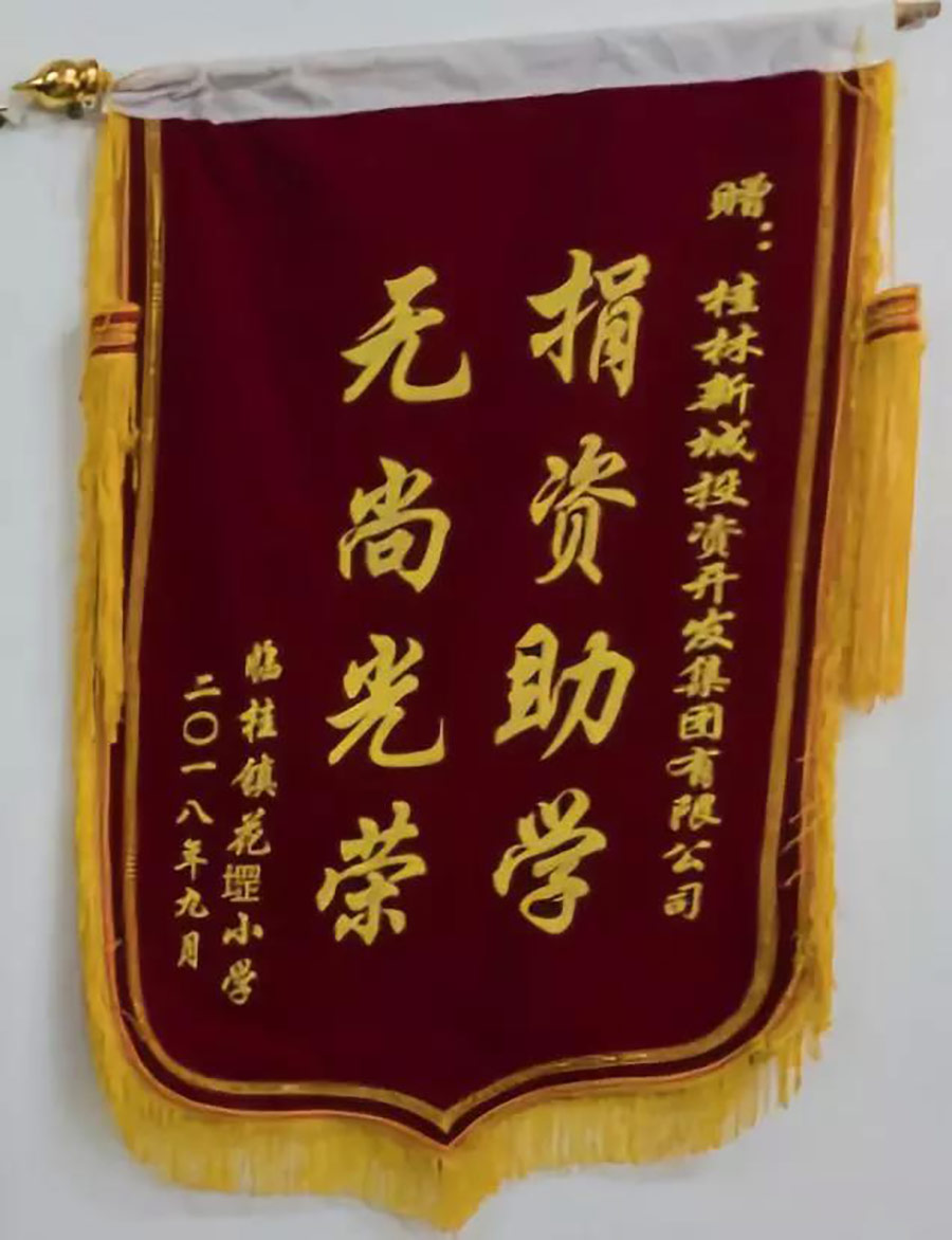2018年9月18日上午,臨桂鎮(zhèn)花堽小學(xué)校長(zhǎng)秦開勝、黨支部書記秦海燕將一面印有“捐資助學(xué),無尚光榮”的錦旗送到新城投資集團(tuán)。集團(tuán)公司黨支部書記周道林、集團(tuán)經(jīng)營(yíng)班子、支部委員一起接受錦旗。