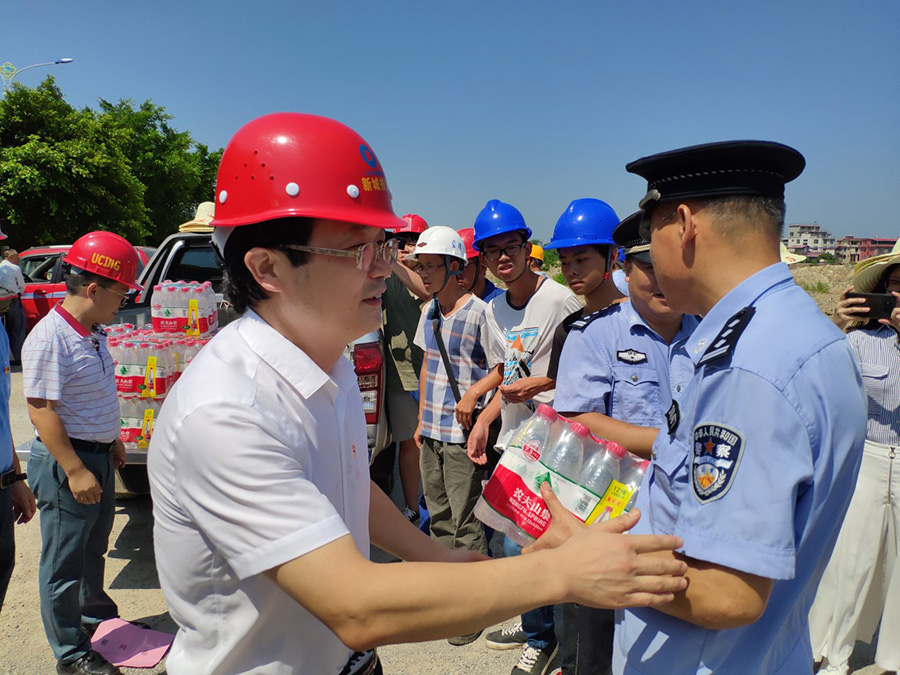 臨桂新區(qū)工委副書記、新區(qū)管委會(huì)副主任、新區(qū)黨總支書記唐標(biāo)明,臨桂新區(qū)工委委員、新區(qū)管委會(huì)副主任、機(jī)關(guān)工會(huì)主席文杰,新城投資集團(tuán)黨支部書記周道林,臨桂新區(qū)工委組織人事部部長(zhǎng)、黨總支紀(jì)檢委員梁利,新城投資集團(tuán)黨支部委員、新城投資集團(tuán)工會(huì)主席譚力源等領(lǐng)導(dǎo)將西瓜、飲用水等防暑降溫用品送到一線建筑工人手中。