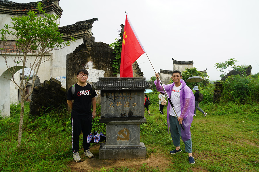 上午11點,同志們乘車到達(dá)全州縣紹水鎮(zhèn)下宅村,整裝齊隊,高舉黨旗,踏上了尋訪當(dāng)年紅軍長征足跡,緬懷革命先烈的紅色之旅。行進(jìn)中,天空下著瓢潑大雨,同志們一邊行軍,一邊唱紅歌,一邊品讀著紅軍長征的艱辛。