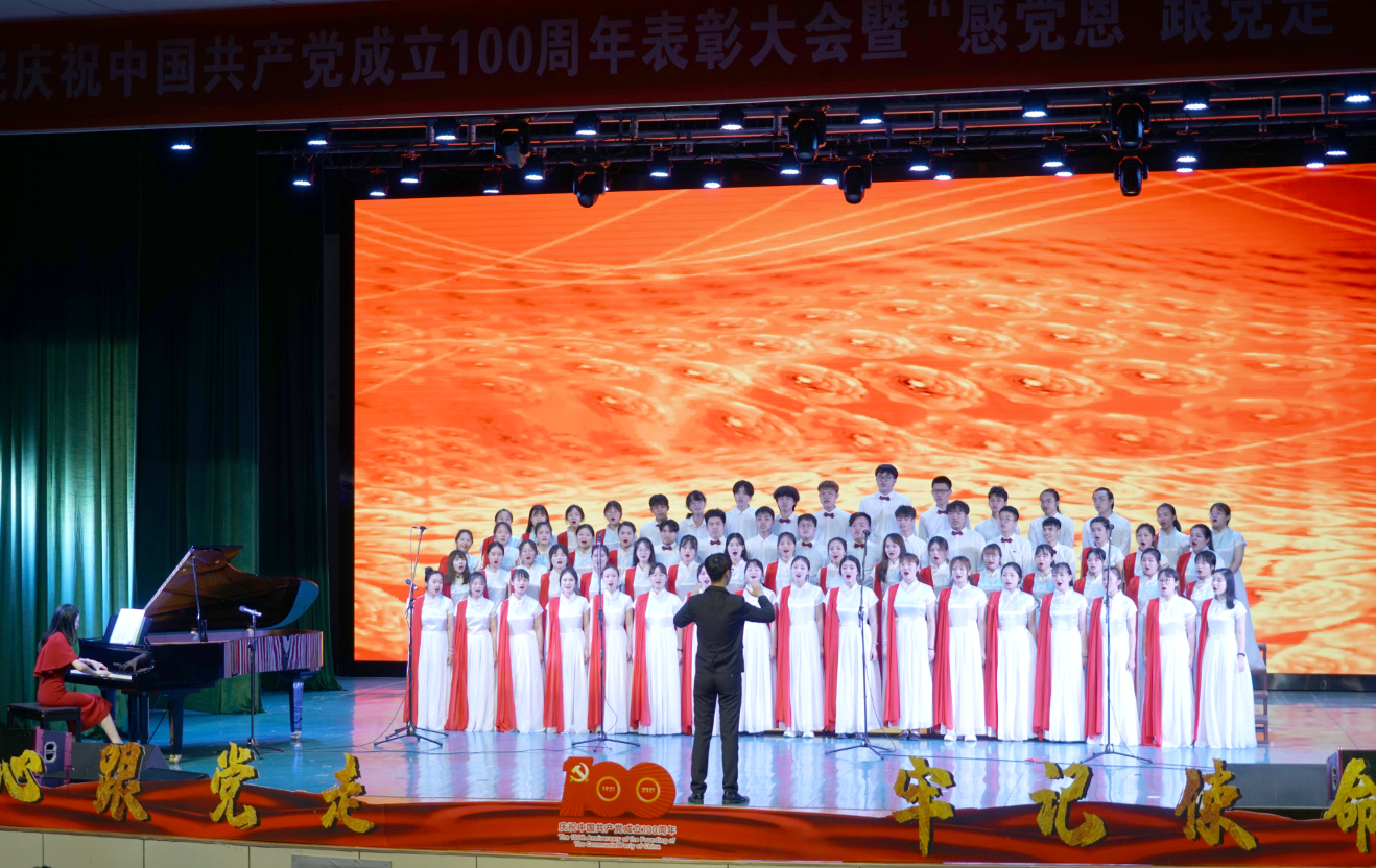 歌詠比賽現(xiàn)場,學校師生用熱情飽滿的姿態(tài)傳唱紅色經(jīng)典,獻禮百年華誕,用歌聲抒發(fā)對黨和祖國的熱愛,表達心中的向往和美好的祝愿。最后,領(lǐng)導嘉賓與學校師生合唱《沒有共產(chǎn)黨就沒有新中國》,氣勢磅礴的歌聲,激昂全場。