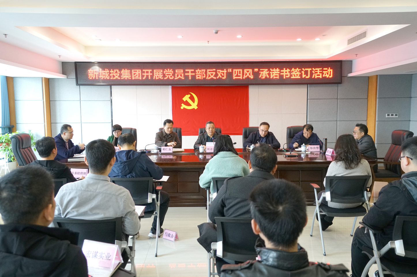 為進(jìn)一步深入貫徹習(xí)近平總書記關(guān)于進(jìn)一步糾治“四風(fēng)”、加強(qiáng)作風(fēng)建設(shè)的論述,深入開展黨員干部涉酒違紀(jì)違法問題專項整治工作,近日,新城投集團(tuán)組織公司班子成員,各部室、子公司負(fù)責(zé)人等黨員干部簽訂《黨員干部和公職人員反對“四風(fēng)”承諾書》,公開承諾帶頭自覺糾正“四風(fēng)”,持之以恒貫徹落實中央八項規(guī)定及其實施細(xì)則精神,主動接受監(jiān)督。集團(tuán)黨總支書記、董事長周道林主持會議。集團(tuán)領(lǐng)導(dǎo)班子成員,各部室、子公司負(fù)責(zé)人參加會議。