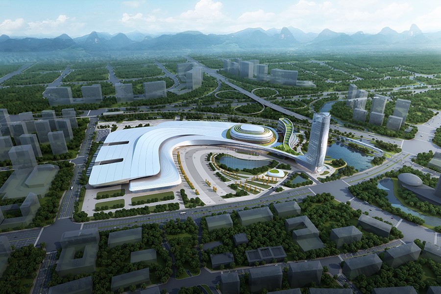 目前正在建設(shè)的桂林國際會展中心項目總投資額676016.31萬元。新會展中心以“江作青羅帶”的漓江為藍(lán)本,設(shè)計為流水彎彎的“漓江彩帶”形象;會議中心以“漓江石”為模板設(shè)計,寓意“石”來運轉(zhuǎn);四星級酒店則吸收桂林城徽象鼻山的意象進(jìn)行設(shè)計;設(shè)計了以龍脊梯田為意象的商業(yè)區(qū),以商業(yè)進(jìn)一步集聚和帶旺新區(qū)人氣等等,從規(guī)劃、選址、設(shè)計上無一不體現(xiàn)出對新會展中心精雕細(xì)琢、精益求精的設(shè)計理念和精神理念。