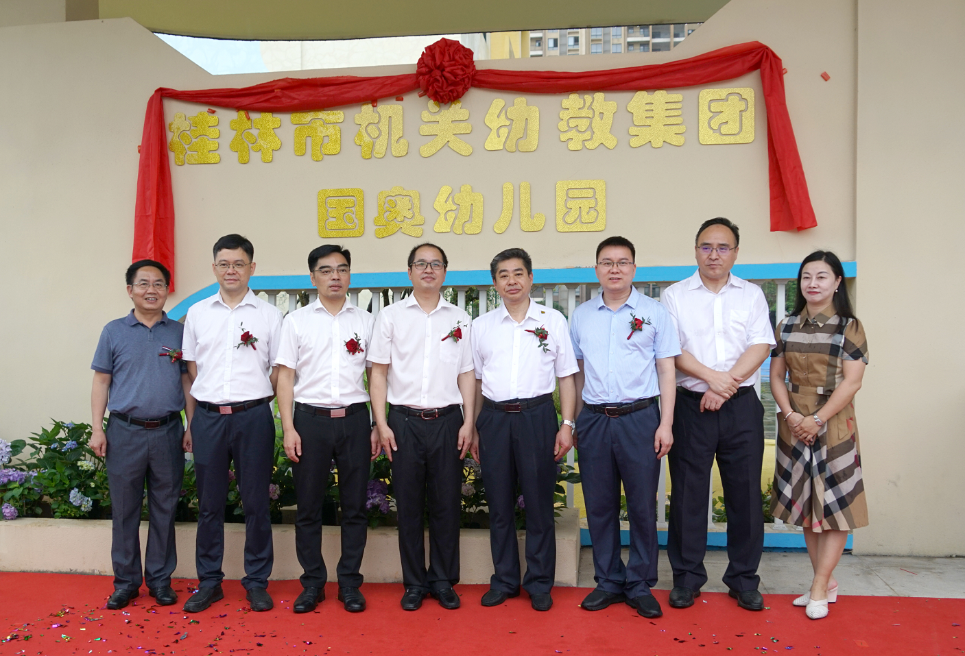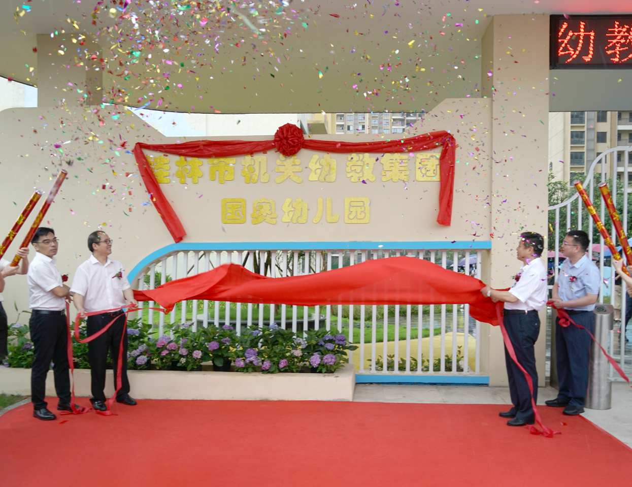 2022年6月13日,桂林市臨桂區(qū)新城國奧花園小區(qū)配套幼兒園交接儀式在幼兒園室內(nèi)小禮堂舉行。市機關事務管理局黨組書記、二級巡視員吳殷丹,市機關事務管理局局長戴波,臨桂新區(qū)黨工委委員、管委會常務副主任李星明,臨桂區(qū)常務副區(qū)長周波,新城投集團黨總支副書記、總經(jīng)理黃峻出席交接儀式?;顒佑膳R桂區(qū)蔣東兵副區(qū)長主持。