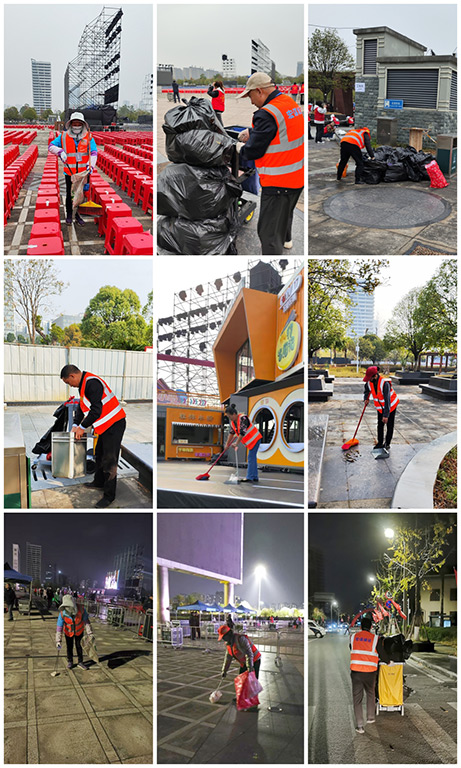 為營造整潔有序的活動氛圍,公司積極履行活動現(xiàn)場環(huán)境衛(wèi)生保障職責,出動了10余名保潔人員及2臺垃圾清運車組成“清潔衛(wèi)士”隊伍,對廣場內的塑料飯盒、礦泉水瓶、包裝袋、發(fā)光棒、煙頭等垃圾進行“地毯式”清理,同時對廣場周邊的28個垃圾桶進行合理調整布局,增加垃圾清運次數(shù),做到垃圾不堆積、不滯留。活動當天,“清潔衛(wèi)士”隊伍加大清掃頻次,延長保潔時間,及時發(fā)現(xiàn)并解決環(huán)境衛(wèi)生問題,共為800名工作、安保人員及上千名觀眾清理了260余包垃圾?;顒忧昂?2天,清理枯枝落葉、舞臺垃圾等總計達5噸,確?;顒訄龅丨h(huán)境舒適與衛(wèi)生。